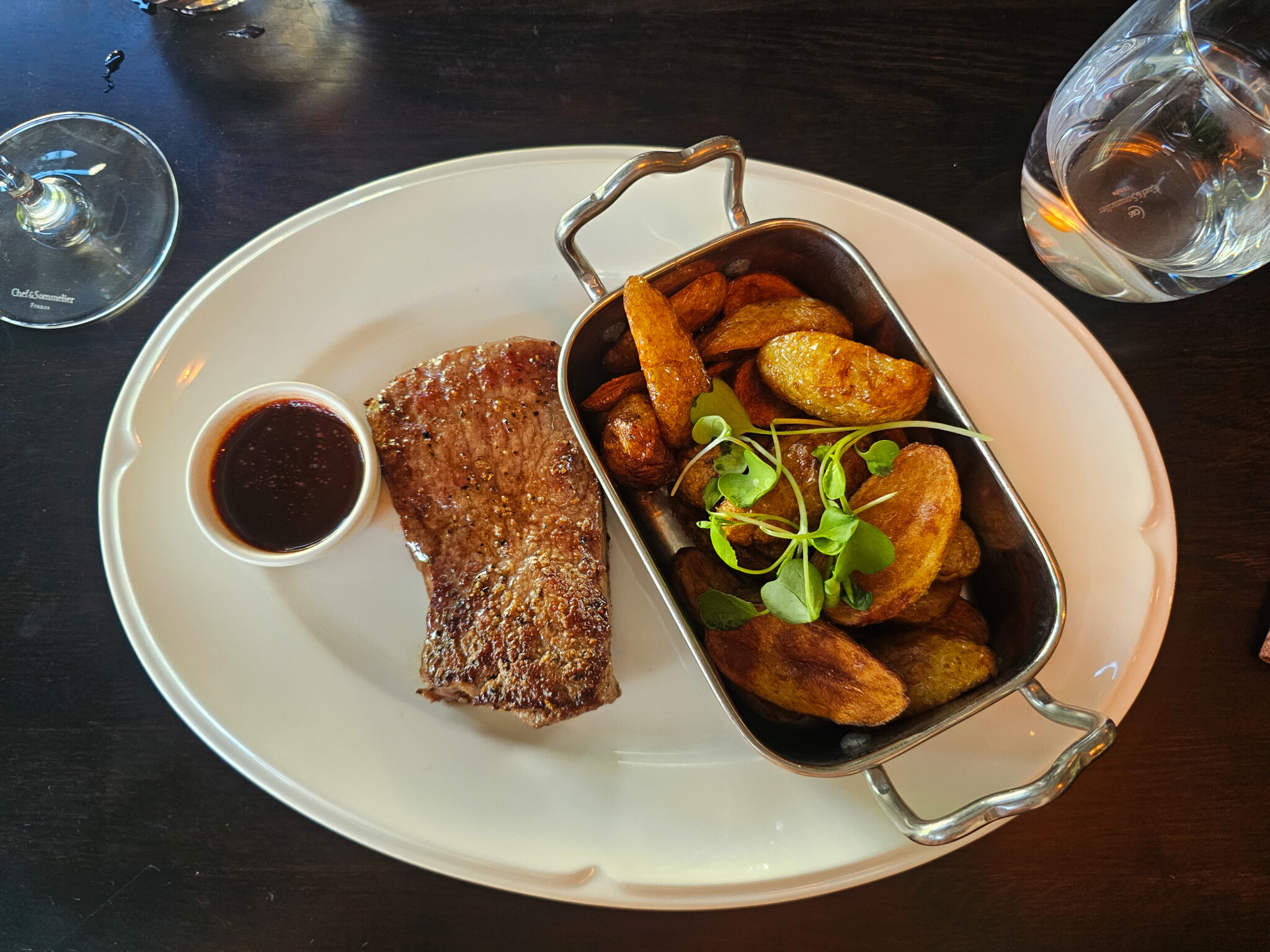Pääruoaksi mä tilasin Steak à la maison-annoksen, joka olisi oikeasti ollut talonpihvi naudan ulkofileestä, tiristettyjä ja valkosipulivoissa pyöriteltyjä perunoita ja béarnaisekastiketta. Mä kuitenkaan en olisi voinut syödä perunoissa olevaa voita tai bearnaisekastiketta, joten ne vaihdettiin mulle. Perunat paistettiin öljyssä (oli todella hyviä!) ja kastikkeeksi vaihdettiin mustaherukka-punaviinikastike, jota olisin voinut juoda suoraan tuolta kulhosta. Pihvin tilasin mediumina ja se oli täydellisesti paistettu.