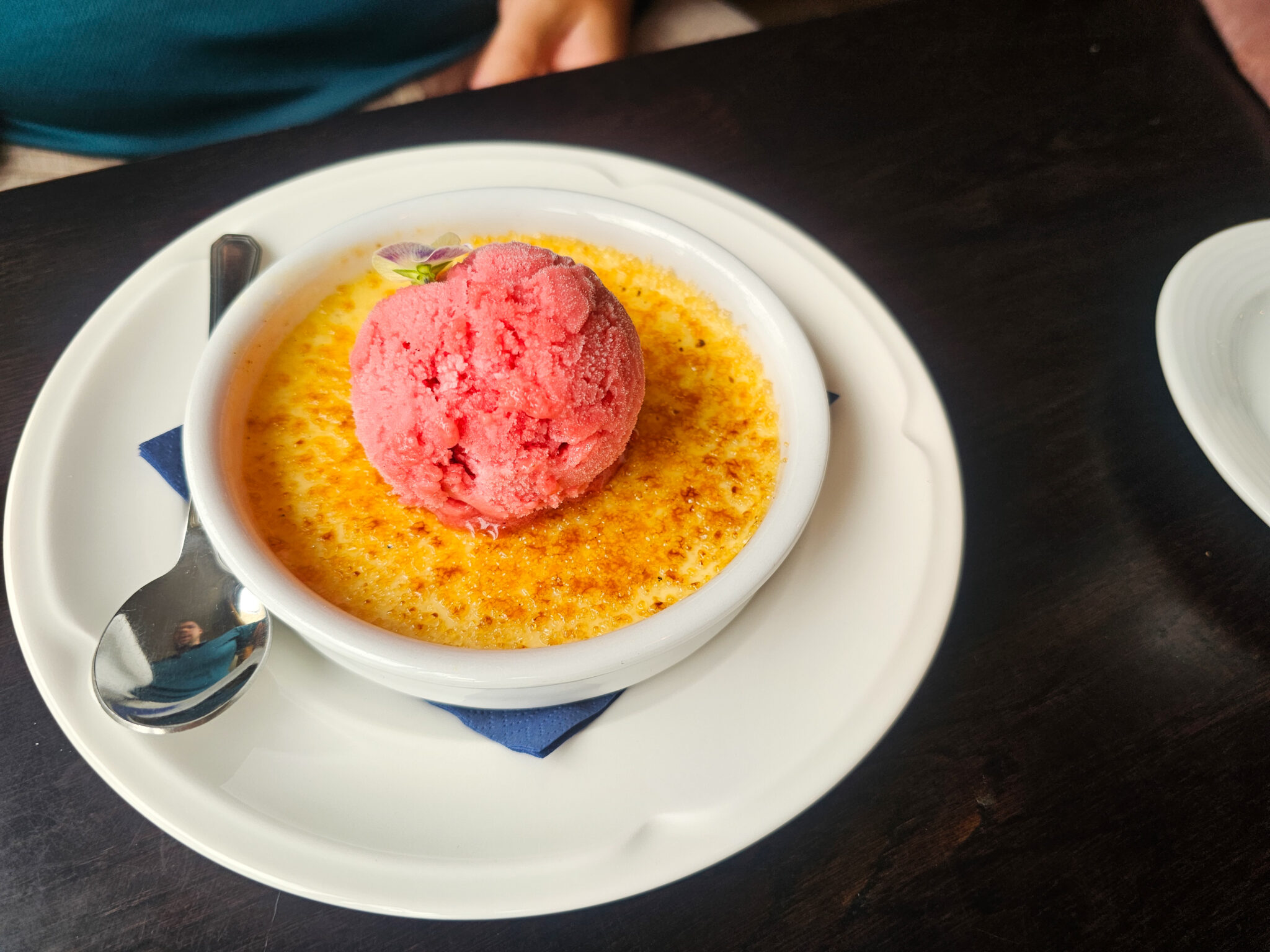 Jani tilasi crème brûléen, jossa oli mansikka-vadelmasorbettia päällä ja kahvin. Haaveilin pöydän toisella puolella Janin jälkkäristä kaihoten vaikka olinkin tyytyväinen omaani.