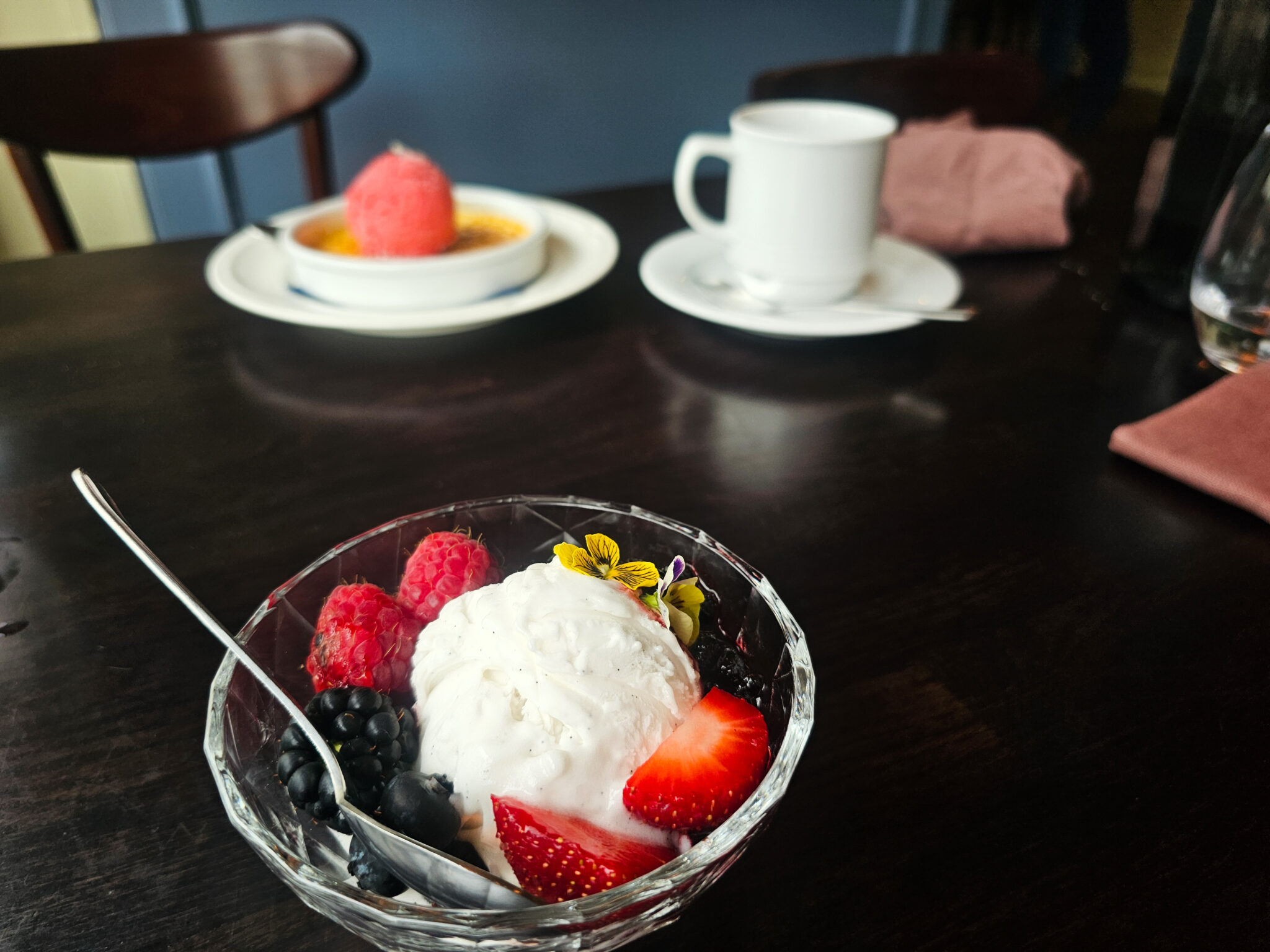 Jälkiruoaksi mulle ei olisi ollut suoraan mitään, koska kaikessa gluteenittomassa oli kauraa, jota mun vatsa ei kestä edes gluteenittomana. Keittiö kuitenkin teki mulle vegaanisen jäätelöannoksen vaniljajäätelöllä ja tuoreilla marjoilla. Jäätelö oli ihanaa ja marjat täydellisen makuisia.