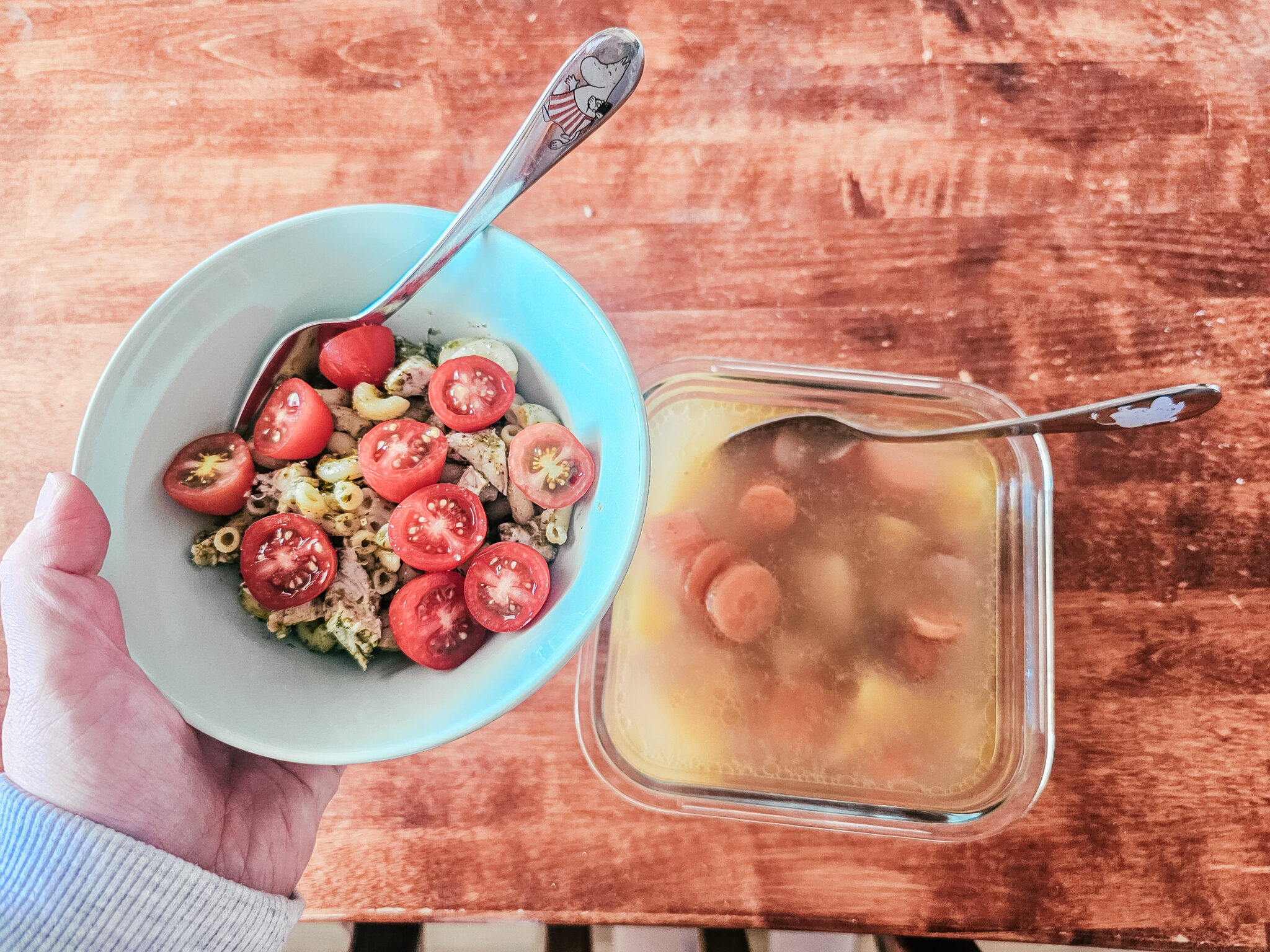 Lounas: Teinillä kouluruokana kalakeittoa, mulla eilisiä uunikasviksia ja nakkeja, miehellä eväänä kana-nuudeliwokkia. 8-vuotias söi pestokanapastaa.