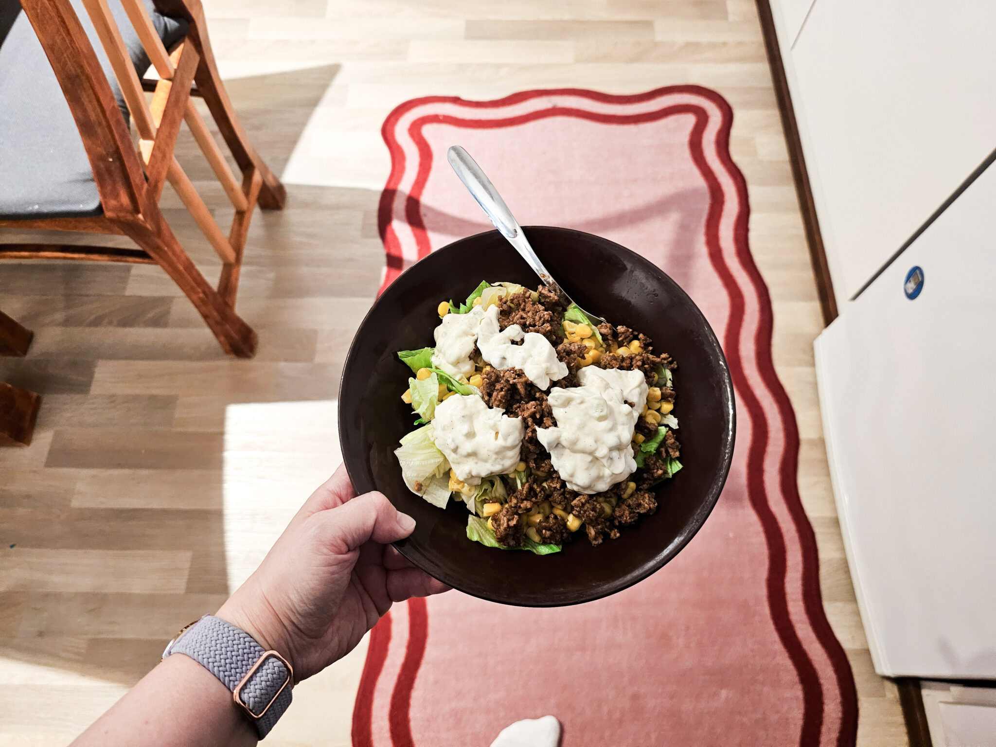 8-vuotias ei päässyt vielä tiistainakaan kouluun ja mulla oli työvuoro. Kerkesin kuitenkin syödä lounaan kotona ennen töihin lähtöä.