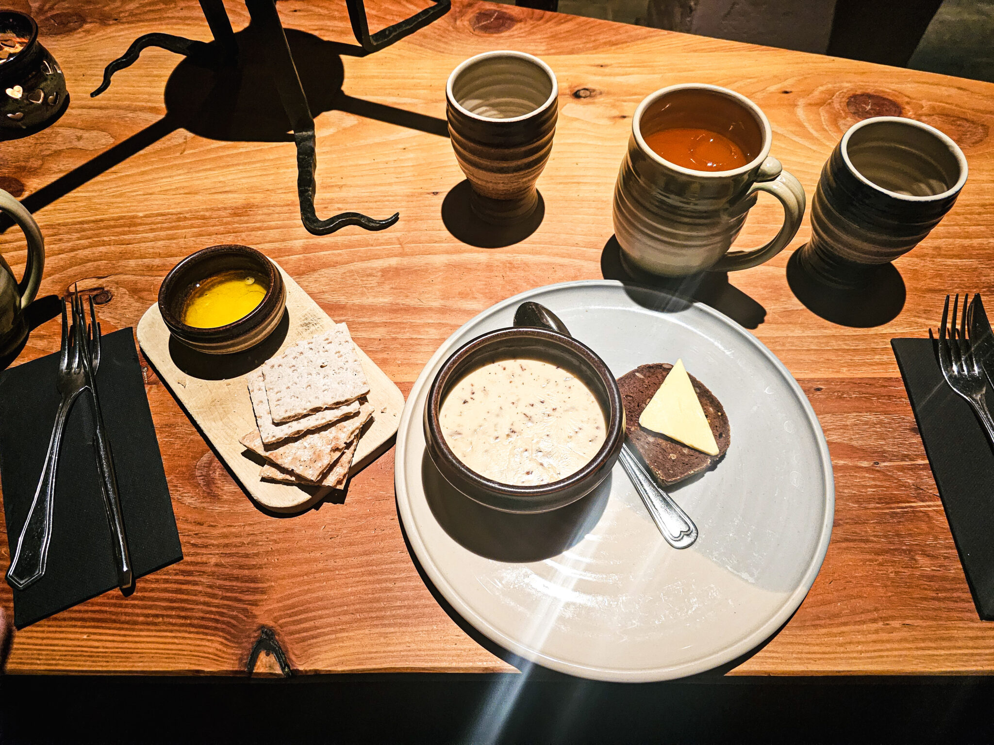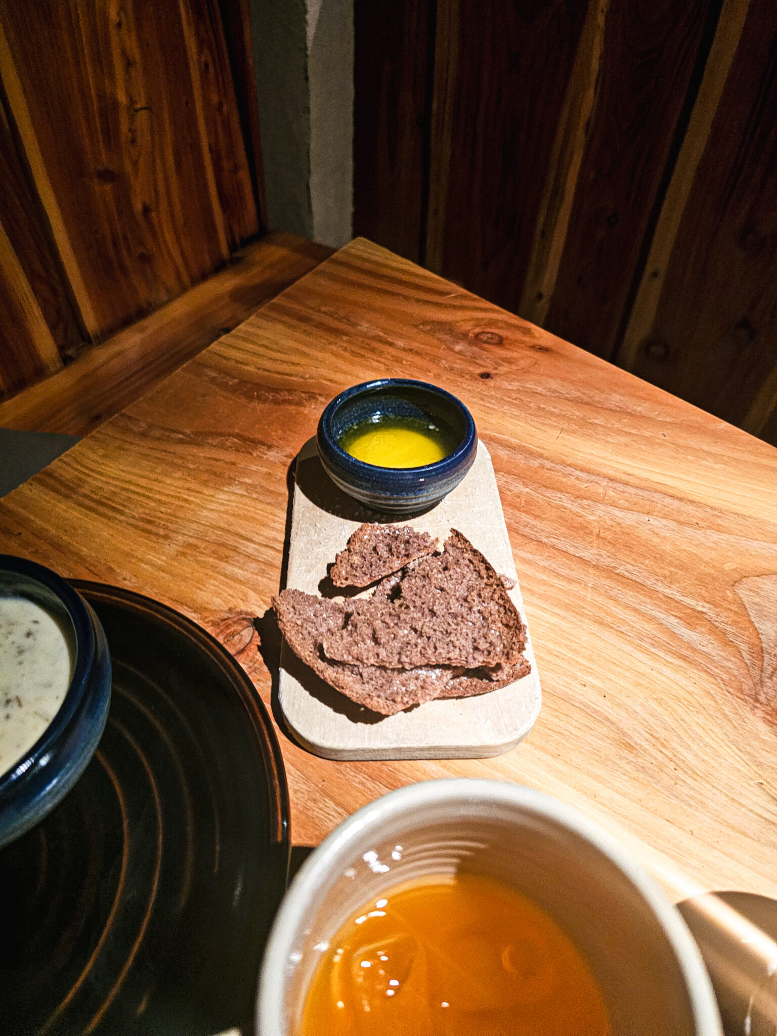 Tilattiin Janin kanssa alkuun sienikeitot ja lisäksi alkupalana tuodaan pöytään aina varrasleipää ja voisulaa. Saatiin ilman lisämaksua myös gluteenitonta näkkileipää. Lapsi tykästyi voisulaan enkä ihmettele, koska se on ihan tajuttoman hyvää.