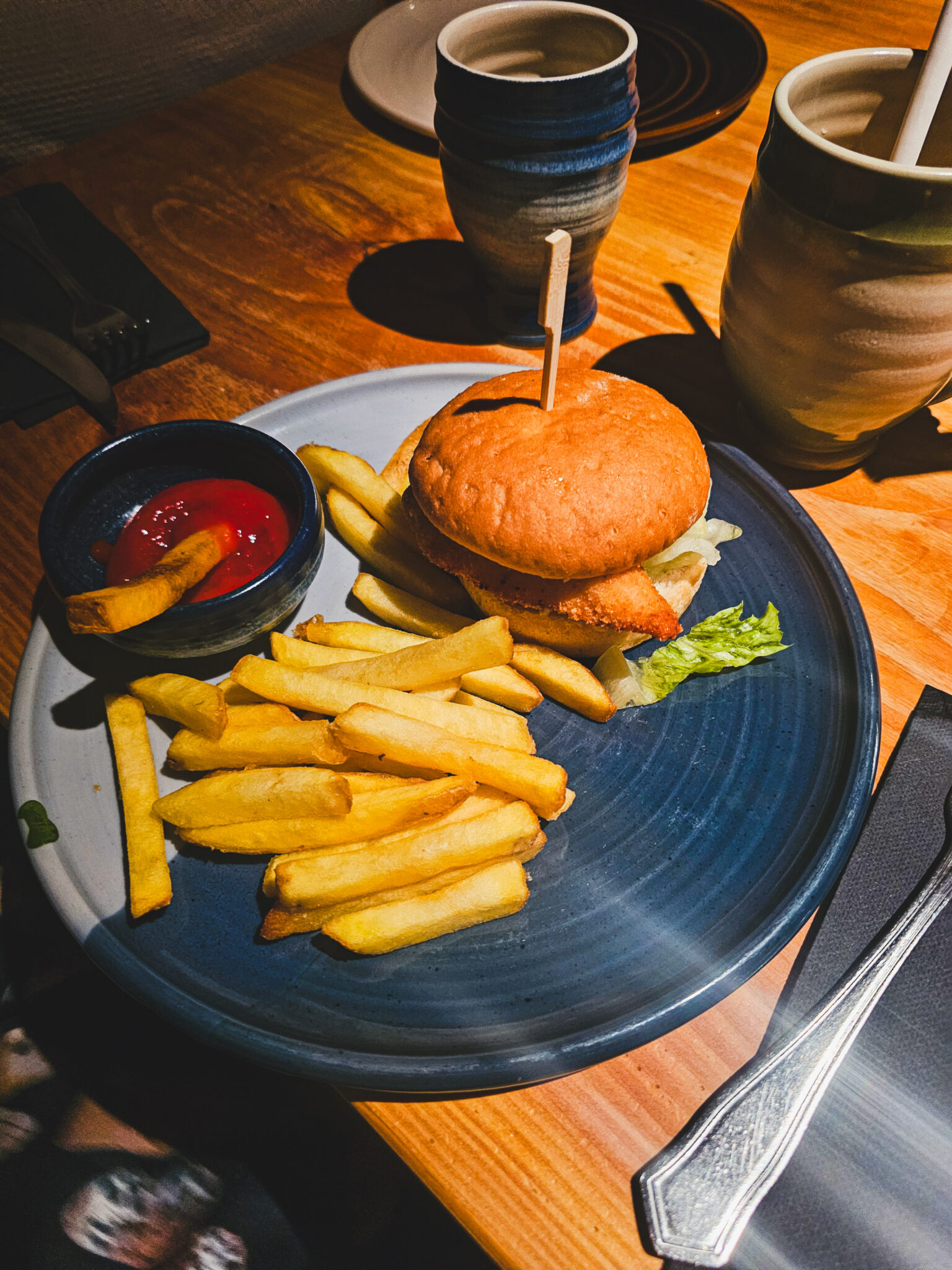 Hirvi- tai kanaburgeri tai friteerattua broilerin sisäfileetä tikkuperunoiden ja ketsupin kera.
