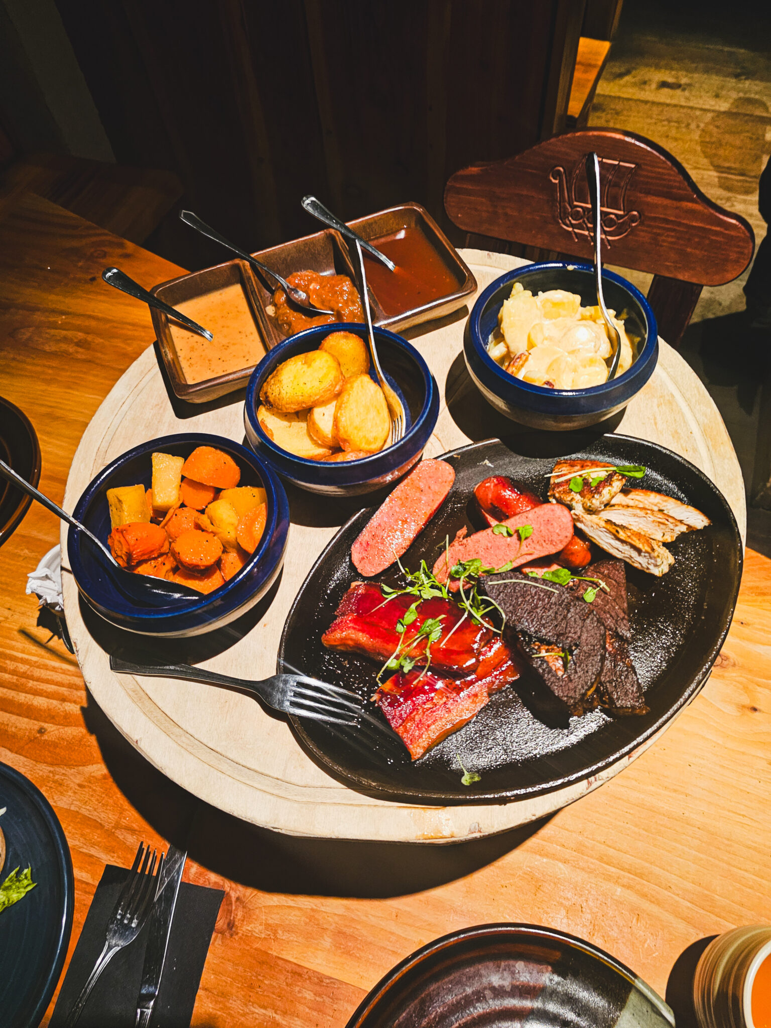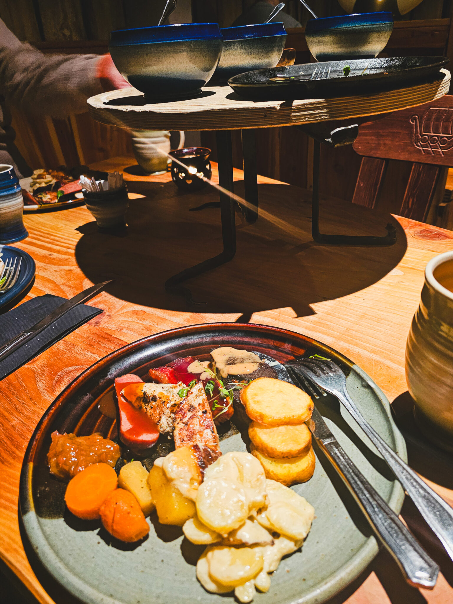 Meidän annoksessa kaikista parasta mun mielestä oli porsaan ribsit ja raparperihilloke! Kaikki oli tosi hyvää, mutta ne oli mun lempparit. Ruoka tarjoillaan aina hauskasti korkealta tarjottimelta ja sieltä saa jokainen maistella mitä haluaa.