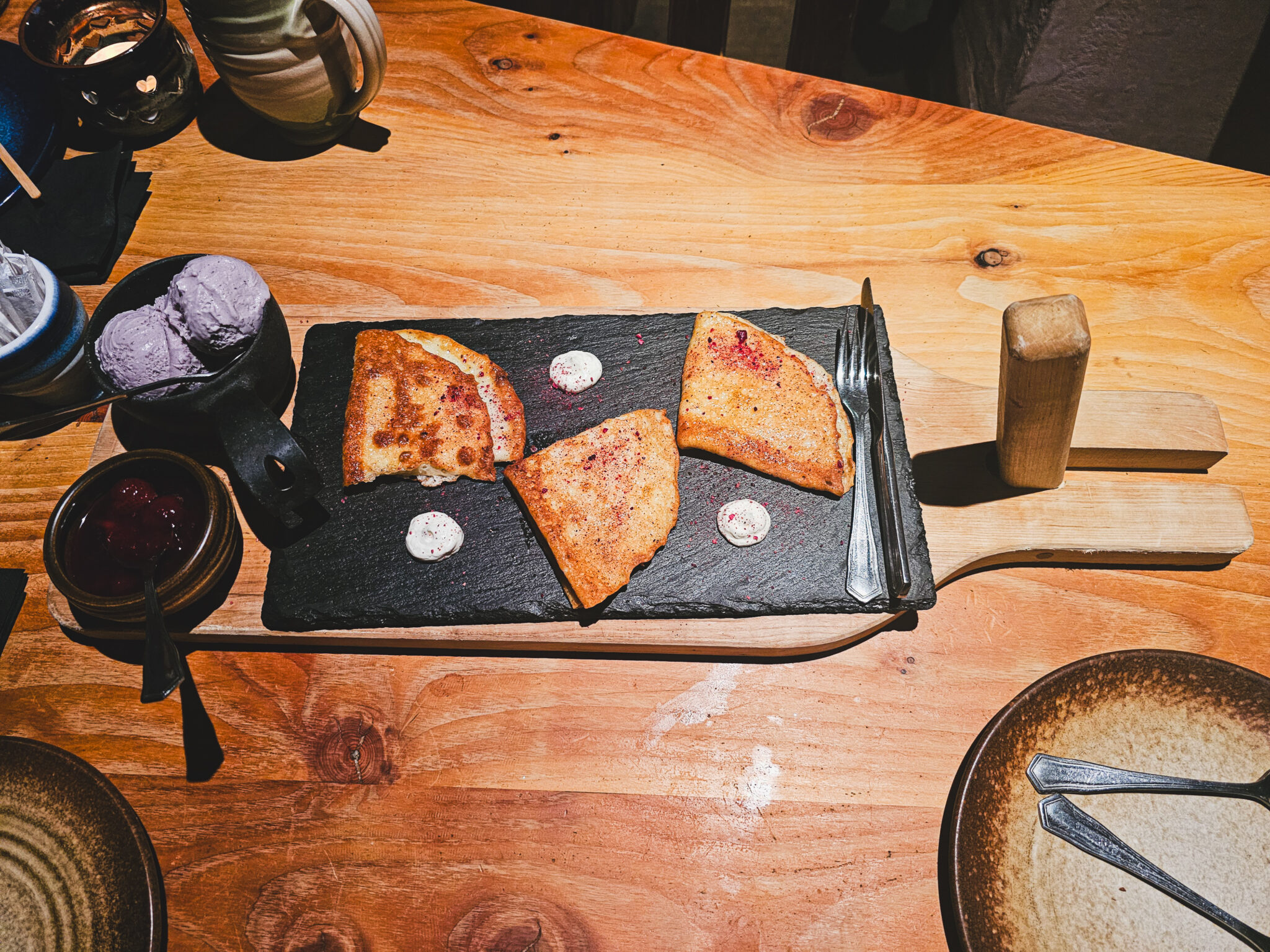Paistettuja lettuja ja vadelmakastiketta, mansikkahilloa, mustikka-kardemummajäätelöä sekä juustokakun makuista moussea