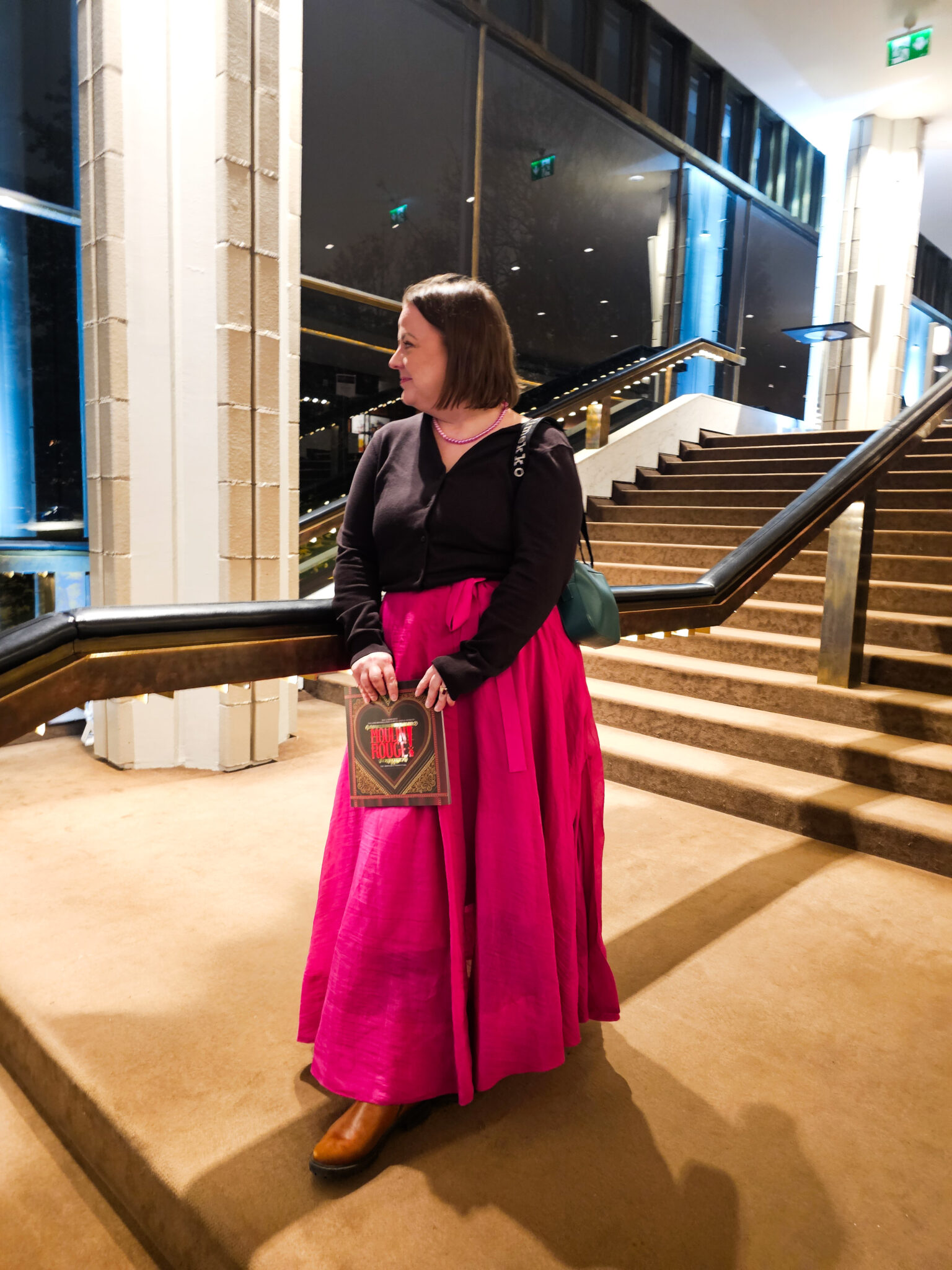 Me ei poistuttu meidän paikoilta ollenkaan väliajalla, mutta jos oltaisiin poistuttu, olisi mua houkuttanut maistaa Punainen Mylly Cocktail, jossa maistui vadelma ja passion. Siitä oli saatavana sekä coctail (16€) että mocktail (14€). Olisi saatettu tilata tällaiset ennen teatteriin menoa, jos olisi oltu paikalla aiemmin, mutta tultiin Helsinkiin samana päivänä ja meille tuli hieman hoppu. Hyvin kuitenkin ehdittiin. Vinkkinä muuten, että narikka on maksuton, joten ulkotakin voi hyvillä mielin jättää sinne.