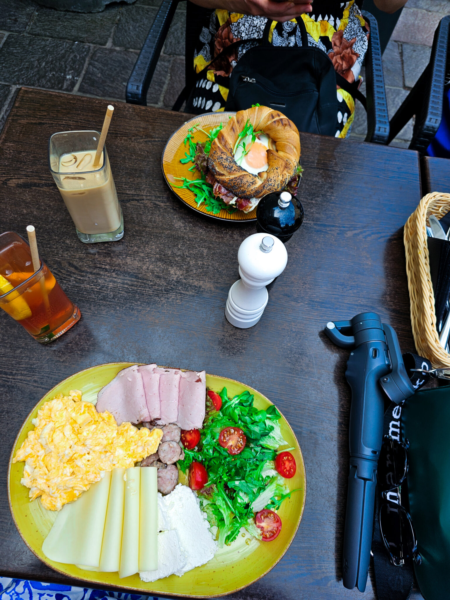 Ystävät ja esikoinen tilasi bagelit erilaisilla täytteillä. Bagelit oli ihan jättimäiset! Esikoinen tilasi omansa nutellalla ja banaanilla, muilla oli suolaiset versiot. Koska mä en voi syödä viljaa, tilasin Polish Breakfast-lautasen ilman leipää (gluteenitonta leipää ei ollut tarjolla, kun sitä kysyin). Siinä oli juustoa, leikkeleitä, makkaraa, munakasta, tosi kummallisen rakenteista raejuustoa sekä salaattia. Tämä annos oli ihan jättimäinen enkä edes jaksanut syödä kaikkea. Se oli kuitenkin listalla ainoa annos, joka sopi mulle.