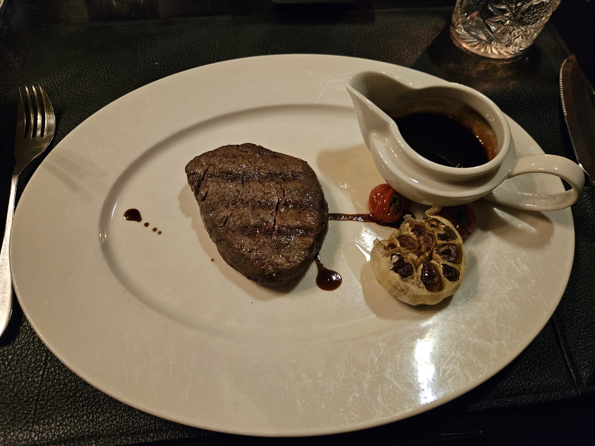 Pihvit oli suussasulavia ja ne oli just niin hyviä kuin oli odotettukin. Lisukkeeksi me otettiin paistettuja herkkusieniä, sipulia ja pekonia. Lisäksi tilattiin molemmille punaviinikastike, jota tarjoilija suositteli. Lisukkeet ja kastikkeet tilattiin erikseen ja otettiin vaan yksi lisuke, joka oli ihan fiksu veto, koska saatiin siitä hyvin molemmille syötävää. Lisäksi pihvin kanssa tuli uunissa paahdettua tomaattia ja valkosipulia, joka oli ihan taivaallisen hyvää.