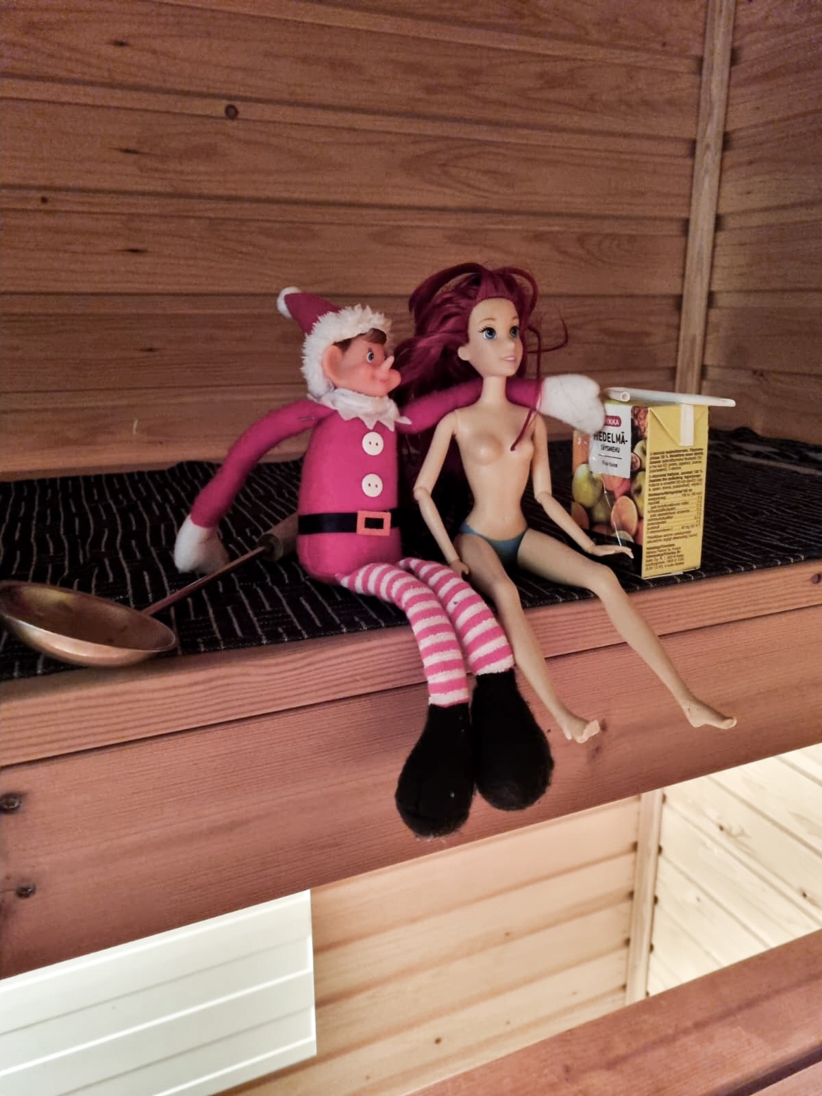 23. Tonttu voi myös saunoa Barbien kanssa. Viereen tyhjät juomat ja lapsi on ihmeissään.