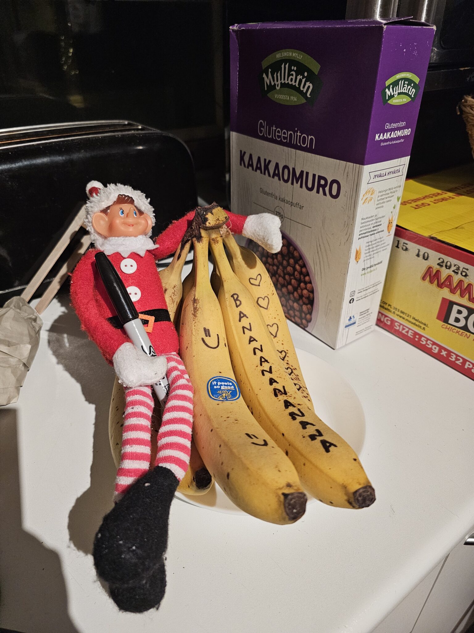 16. Tonttu voi piirtää tussilla banaanin kuoriin kuvioita. Vain taivas on rajana keksiä mitä banaaneissa voi lukea. Tai niille voi vaikka liimata muoviset silmät ja piirtää suut.
