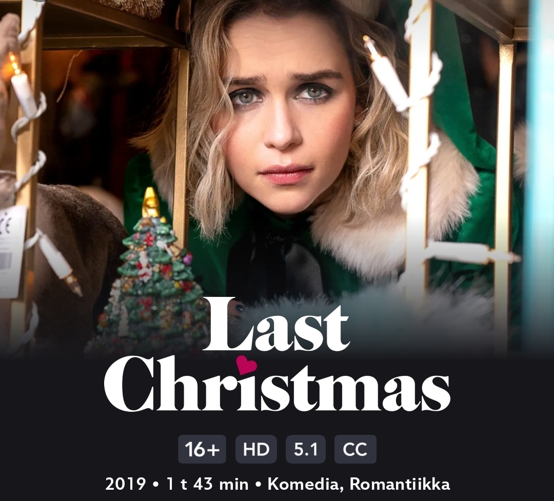 En tiedä miksi tää on Disney+ mielestä 16+, mutta leffa ei sitä todellakaan ole! Tämä on ihana romanttinen komedia itsensä löytämisestä, jouluilosta ja ehkä vähän sydänsurustakin. Mä katson tämän aina joulun alla ja rakastan tätä joka vuosi vaan enemmän. Elokuva kertoo kyynisestä Katesta, joka työskentelee joulumyymälässä ja vihaa elämäänsä. Hän kuitenkin tapaa Tomin, joka palauttaa hänen uskonsa jouluun ja sen ihmeisiin.