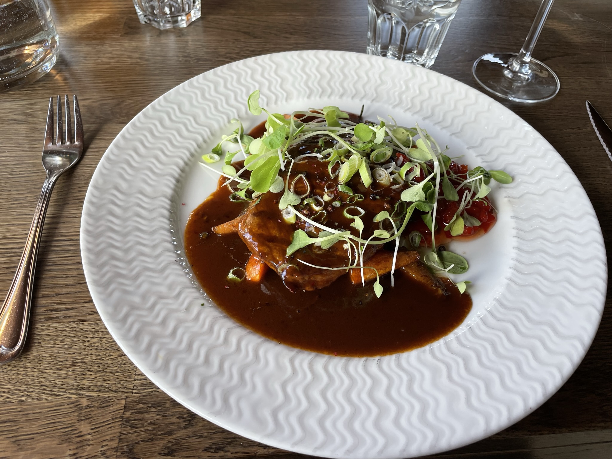 Minulle perinteinen pippuripihvi naudan ulkofileestä kermaisella pippurikastikkeella, varsiparsa-porkkanapaistoksella ja paholaisen hillolla