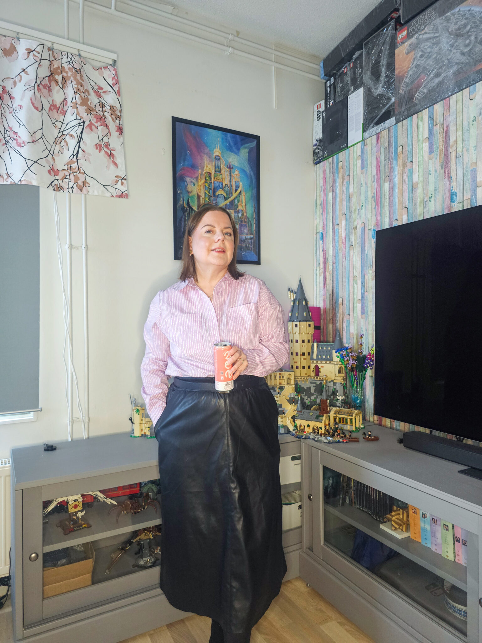 Makuna tässä oranssissa purkissa oli persikka ja aprikoosi. Koska kaivoin tämän esiin jääkaapista, oli tölkin väritys mulle hieman inspiraationa asua valitessa. Nimittäin päälle valikoitui raidallinen, hempeän sävyinen *Finlaysonin Korte-paitapusero ja 2nd handina löytynyt Lindexin keinonahkahame.