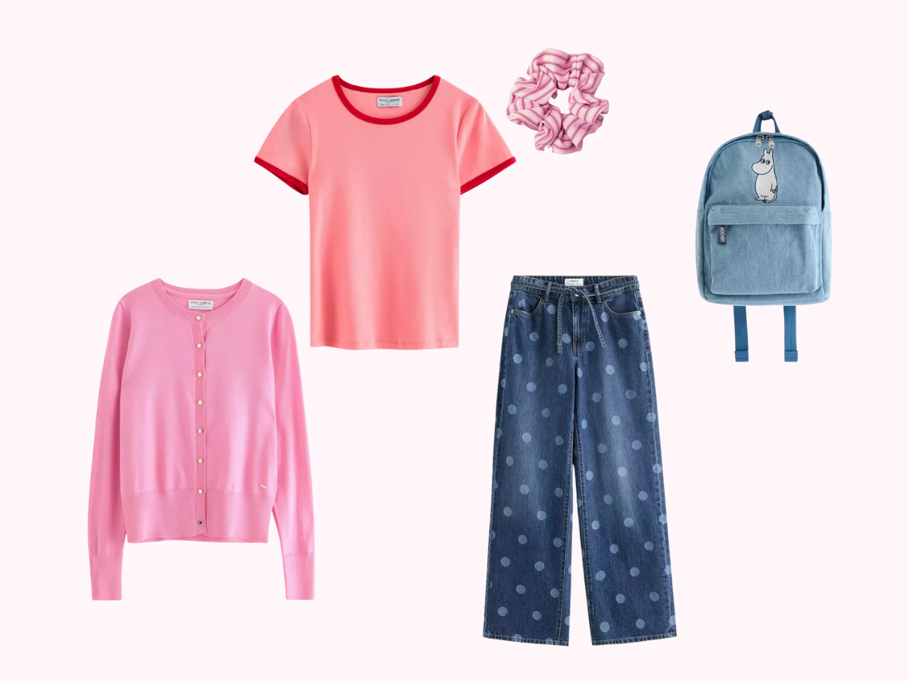 *t-paita | *neuletakki | *farkut | *hiusdonitsi | *lasten Muumi-reppu