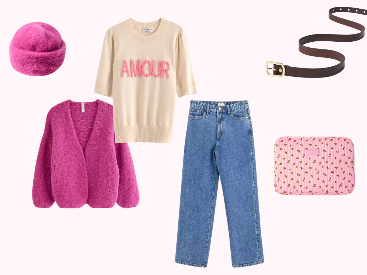 *kietaisuneule | *kauluspaita | *farkut | *korvikset | *vyö | *rannekoru